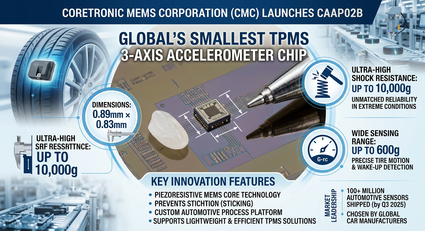 2025/12/15 中強光電的子公司中光電智能感測(CMC)推出了一款名為 CAAP02B 的三軸加速度感測晶片,專為胎壓偵測系統(TPMS)設計。這款晶片是目前全球同類產品中尺寸最小的,預計將在2026年上半年開始量產。