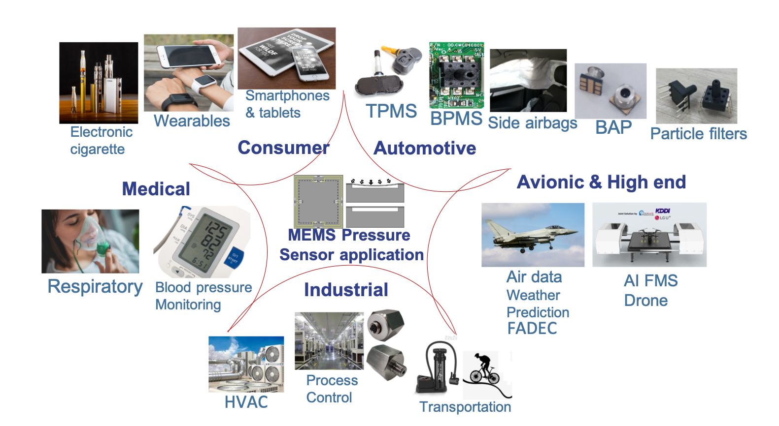 氣壓感測器的應用極為廣泛。在小型化、低功耗且高成本效益的帶動下,近年在智慧型手機、無人機、電子菸、家電等消費市場大量導入了MEMS氣壓計﹔而由於汽車市場走向綠能並提高安全要求,使得MEMS氣壓感測器的需求快速成長。此外,在邁向工業4.0及AIoT時,MEMS壓力感測器提供了壓力監控及智慧量測等功能,也促進了工業市場的逐步轉型。
